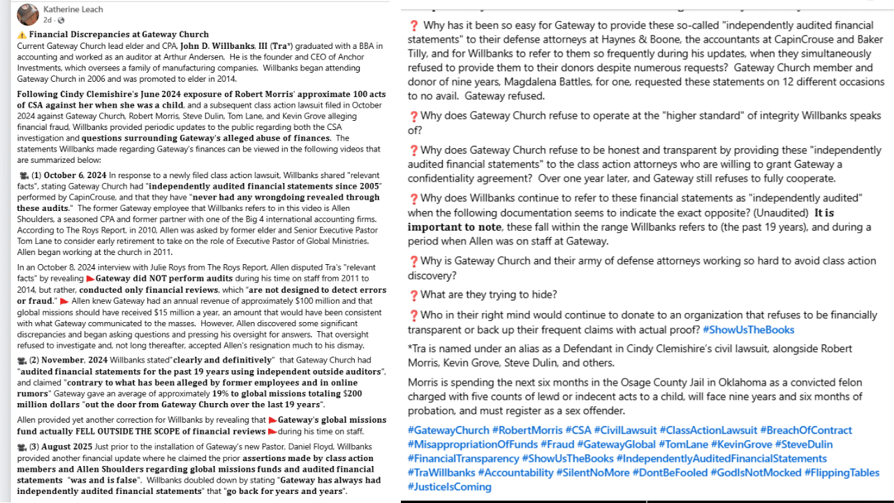 Despite this, Tra Willbanks, an elder at Gateway, continues to assert that the church regularly conducts audits.