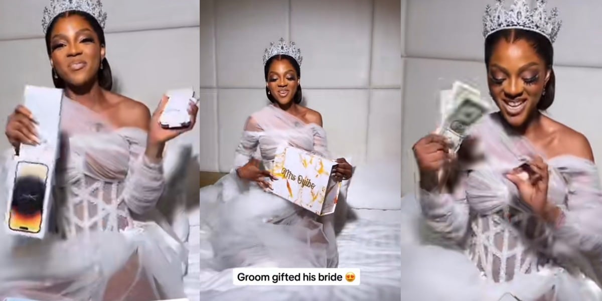 "Am I a spoon?" - Beautiful bride sparks jealousy as she gets iPhone 15 Pro Max, wad of dollars as gifts on wedding day