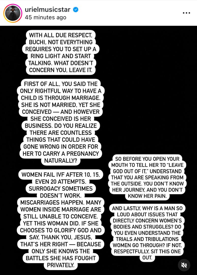 Big Brother Naija star, Uriel Oputa, has taken to social media to address social commentator, Solomon Buchi, regarding his comments about media personality, Toke Makinwa's pregnancy.  In a video shared on his social media pages, Buchi expre...