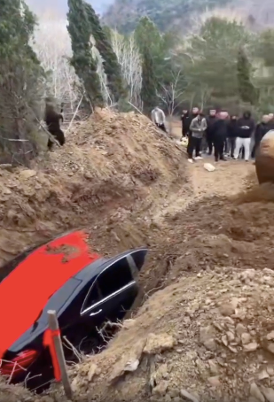 Footage from the scene shows the vehicle decorated with a red traditional ribbon before being lowered into the ground. An excavator was then used to pour soil directly onto the car during the burial process.