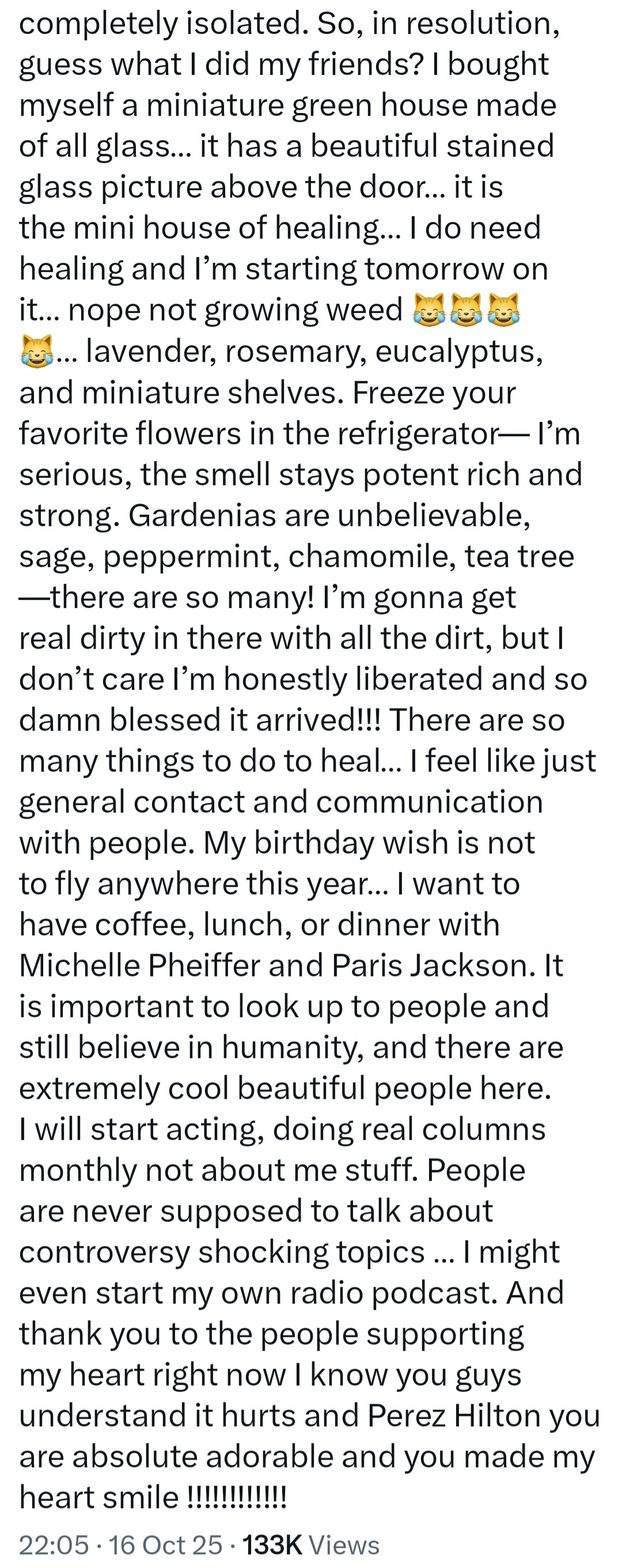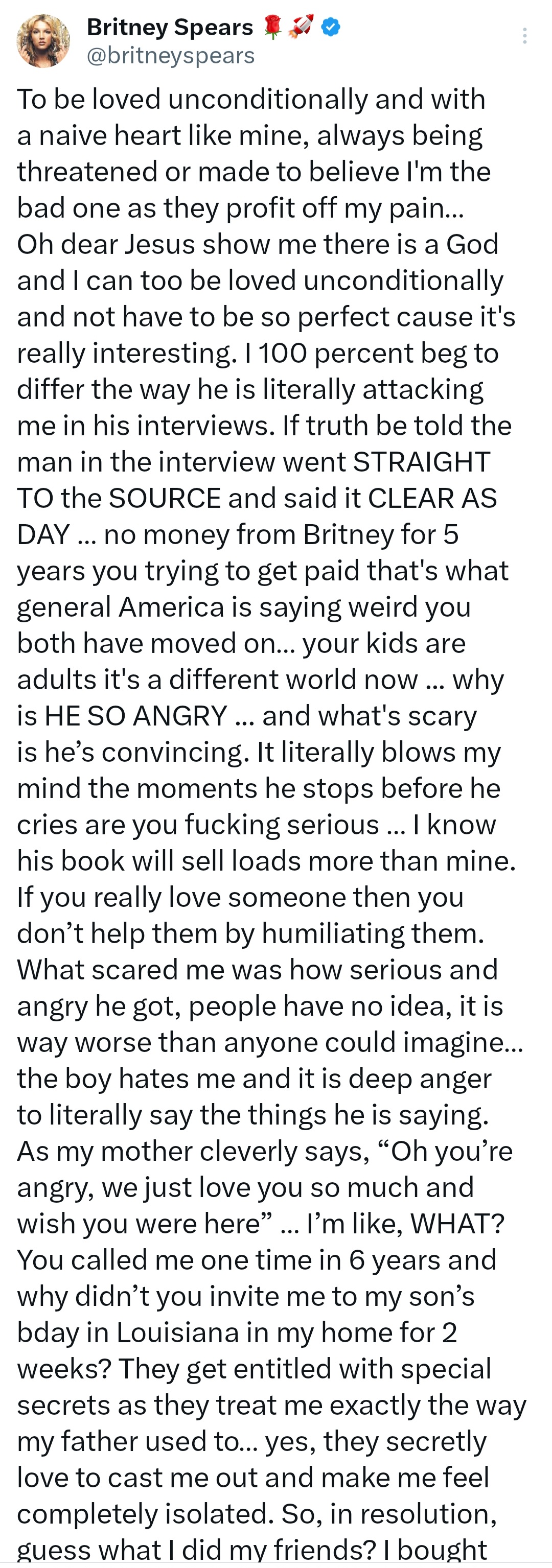Britney Spears is speaking out again. The 43-year-old superstar shared a lengthy statement on social media following headlines from her ex Kevin Federline's forthcoming memoir, You Thought You Knew. In the memoir, Federline accused Britney of a number of things, including sniffing cocaine while breastfeeding their sons, standing over their sleeping sons with a knife, and calling her ex Justin Timberlake on the eve of their wedding. Britney has now releases a second statement to address the claims made in the book. She wrote: "To be loved unconditionally and with a naive heart like mine, always being threatened or made to believe I'm the bad one as they profit off my pain "Oh dear Jesus show me there is a God and I can too be loved unconditionally and not have to be so perfect cause it's really interesting. "I 100 percent beg to differ the way he is literally attacking me in his interviews. If truth be told the man in the interview went STRAIGHT TO the SOURCE and said it CLEAR AS DAY no money from Britney for 5 years you trying to get paid that's what general America is saying weird you both have moved on your kids are adults it's a different world now ... why is HE SO ANGRY ... and what's scary is hes convincing. It literally blows my mind the moments he stops before he cries are you fucking serious  "I know his book will sell loads more than mine. If you really love someone then you dont help them by humiliating them. What scared me was how serious and angry he got, people have no idea, it is way worse than anyone could imagine the boy hates me and it is deep anger to literally say the things he is saying. As my mother cleverly says, 'Oh youre angry, we just love you so much and wish you were here' Im like, WHAT? You called me one time in 6 years and why didnt you invite me to my sons bday in Louisiana in my home for 2 weeks? "They get entitled with special secrets as they treat me exactly the way my father used to yes, they secretly love to cast me out and make me feel completely isolated. "So, in resolution, guess what I did my friends? I bought myself a miniature green house made of all glass it has a beautiful stained glass picture above the door it is the mini house of healing "I do need healing and Im starting tomorrow on it nope not growing weed lavender, rosemary, eucalyptus, and miniature shelves. Freeze your favorite flowers in the refrigerator Im serious, the smell stays potent rich and strong. Gardenias are unbelievable, sage, peppermint, chamomile, tea tree there are so many! Im gonna get real dirty in there with all the dirt, but I dont care Im honestly liberated and so damn blessed it arrived!!! "There are so many things to do to heal I feel like just general contact and communication with people. "My birthday wish is not to fly anywhere this year I want to have coffee, lunch, or dinner with Michelle Pheiffer and Paris Jackson. It is important to look up to people and still believe in humanity, and there are extremely cool beautiful people here. "I will start acting, doing real columns monthly not about me stuff. People are never supposed to talk about controversy shocking topics I might even start my own radio podcast. "And thank you to the people supporting my heart right now I know you guys understand it hurts and Perez Hilton you are absolute adorable and you made my heart smile !!!!!!!!!!!!" The post "Dear Jesus, show me there's a God" Britney Spears releases new lengthy statement amid ex Kevin Federline's memoir about her appeared first on Linda Ikeji Blog.
