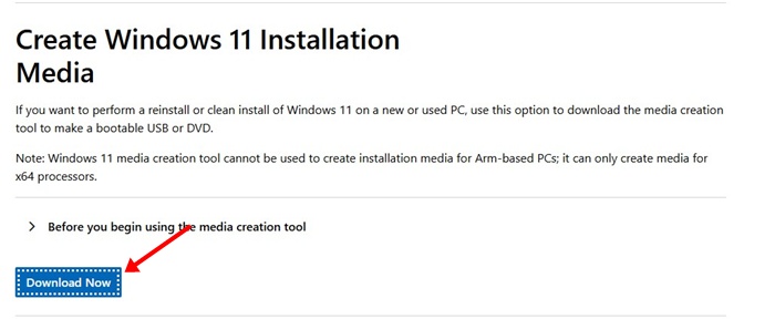 1. Open this webpage and click the Download Now button on the Create Windows 11 Installation Media.