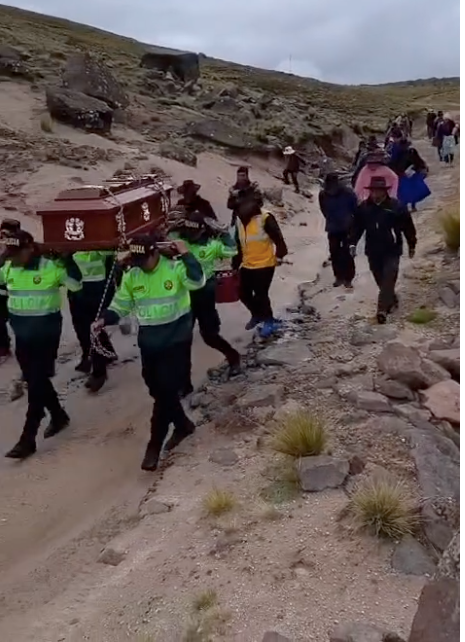 Moved by her situation, the National Police of Peru stepped in to assist. Four uniformed officers carried the wooden coffin for about two kilometers across rocky terrain in the rural village of Quillcaccasa, located in the southern Peruvian region of Ayacucho.