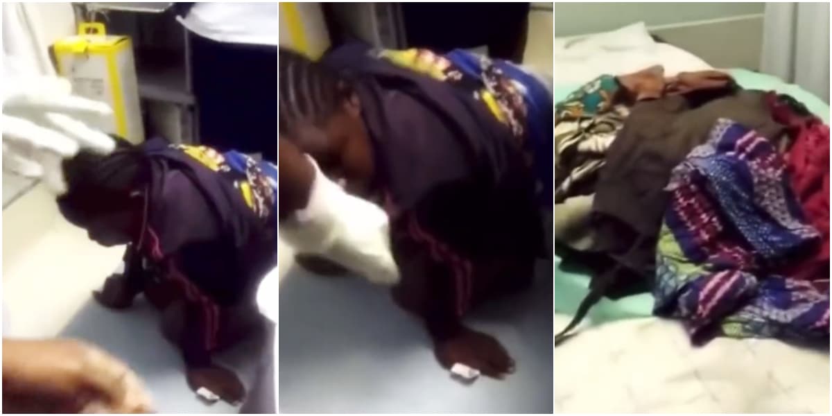 In the video, the lady can be seen on all fours while the makeshift baby bump, constructed with rags and clothes, is spread out on the hospital bed.