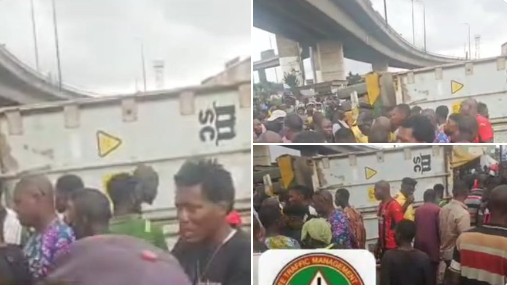 Police officer and woman k!lled as 40-ft container falls on tricycle in Lagos