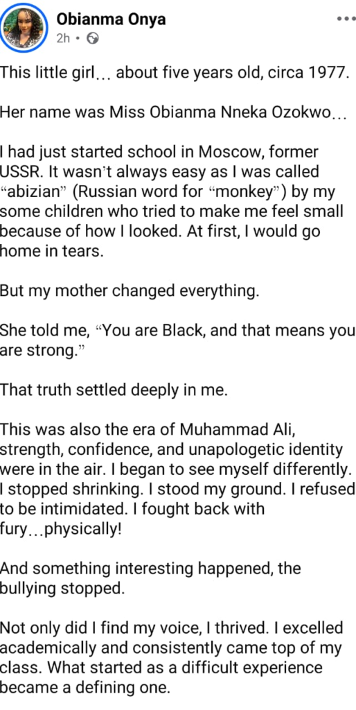 In a post on Facebook, she revealed how she was repeatedly called a derogatory term, “abizian,” by some children who mocked her because of her skin color.