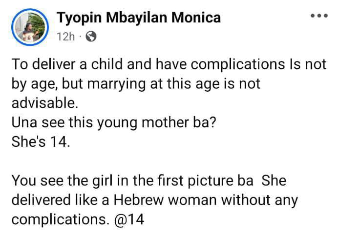 A woman named Tyopin Mbayilan Monica has taken to Facebook to share a story about a 14-year-old girl who successfully gave birth without any complications.